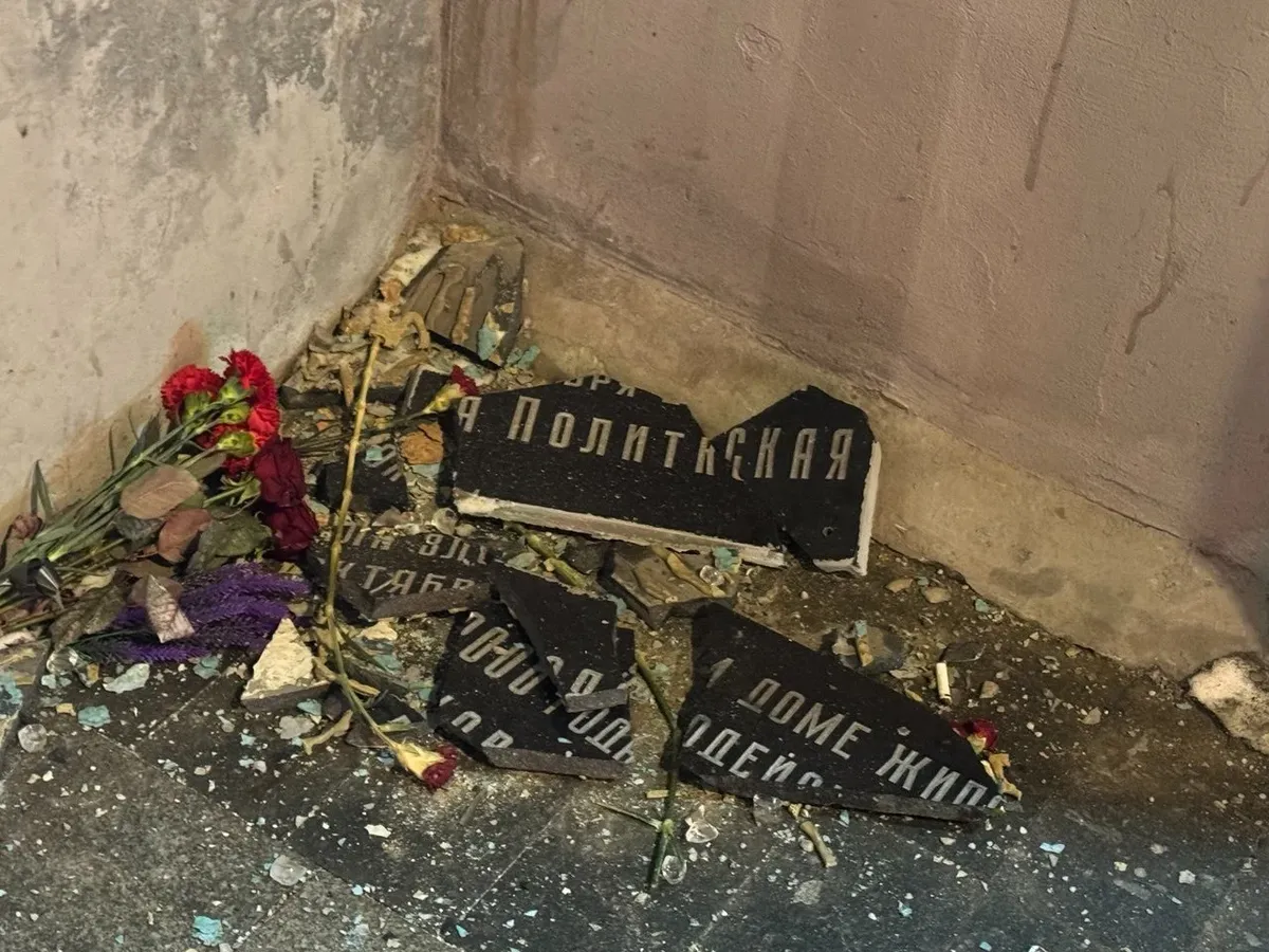 «7», «убит», «Политковс» — в первый вечер осколки того, что недавно было мемориальной табличкой, лежавшие у ободранной стены дома, были похожи то ли на плохой пазл, то ли на куски льда, из которых Каю в «Снежной королеве» надо было сложить слово «вечность». Сорванную неонацистами и явно тщательно раздробленную доску тут же сравнили с оборванными «Последними адресами». И потому что адрес действительно был последний, и потому что в паре метров, на фасаде того же дома, уже белело пятно поменьше — от сорванной таблички с именами репрессированных. И хотя уже на следующий день вокруг подъезда началась та же война за память, которая давно идет вокруг «Адреса»,
