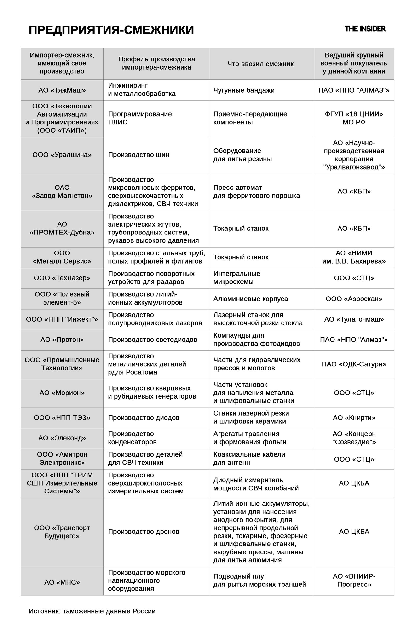 В третьей группе — предприятия-смежники, производящие в России для ВПК отдельные важные узлы, блоки или агрегаты, но существенно зависящие от импорта в страну сырья и компонентов. Это наиболее интересная группа импортеров-частников, ведущих бизнес с ВПК. Примеры таких предприятий и их продукции (в порядке убывания их объема торговли с ВПК) в таблице ниже: