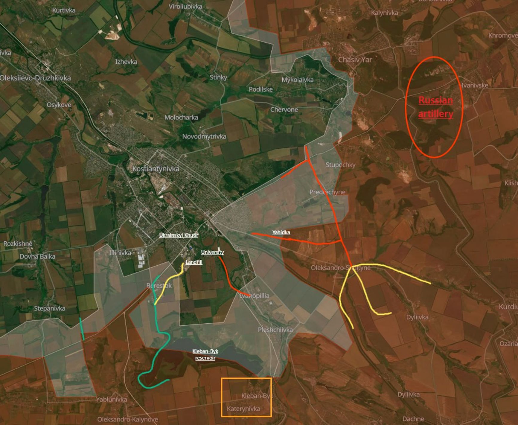 Исследователь под ником Playfra нанес на карту все российские атаки в районе Константиновки за последние пару дней, отметив красным безуспешные, а зеленым — наиболее успешные. В частности, российским военным удалось закрепиться около Берестка. Также они были вновь замечены в микрорайоне Украинский Хутор на юго-западе Константиновки.