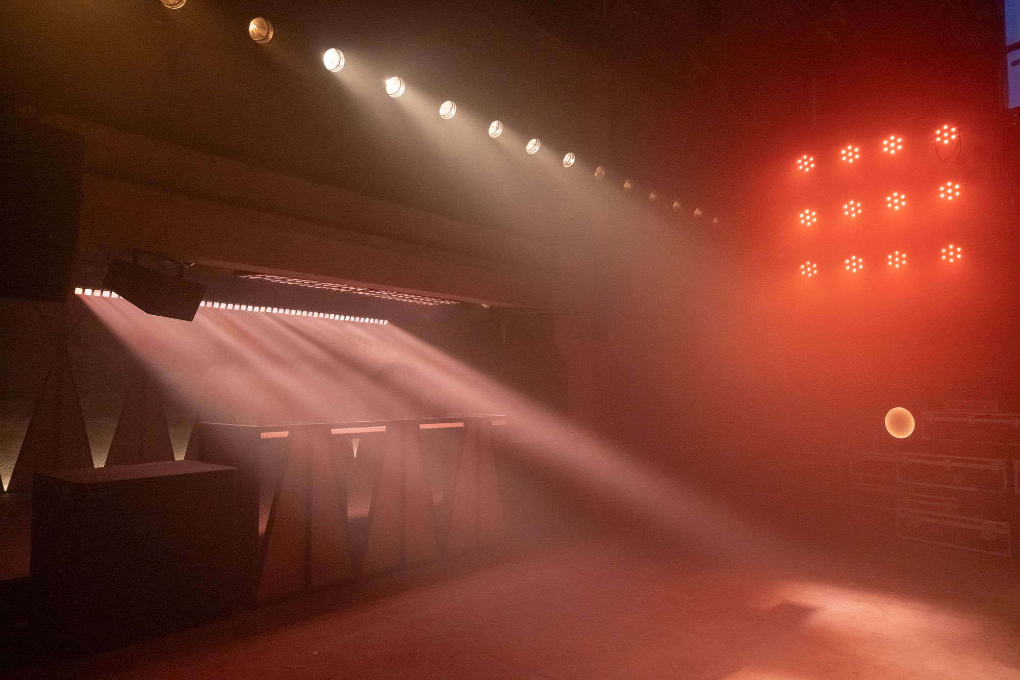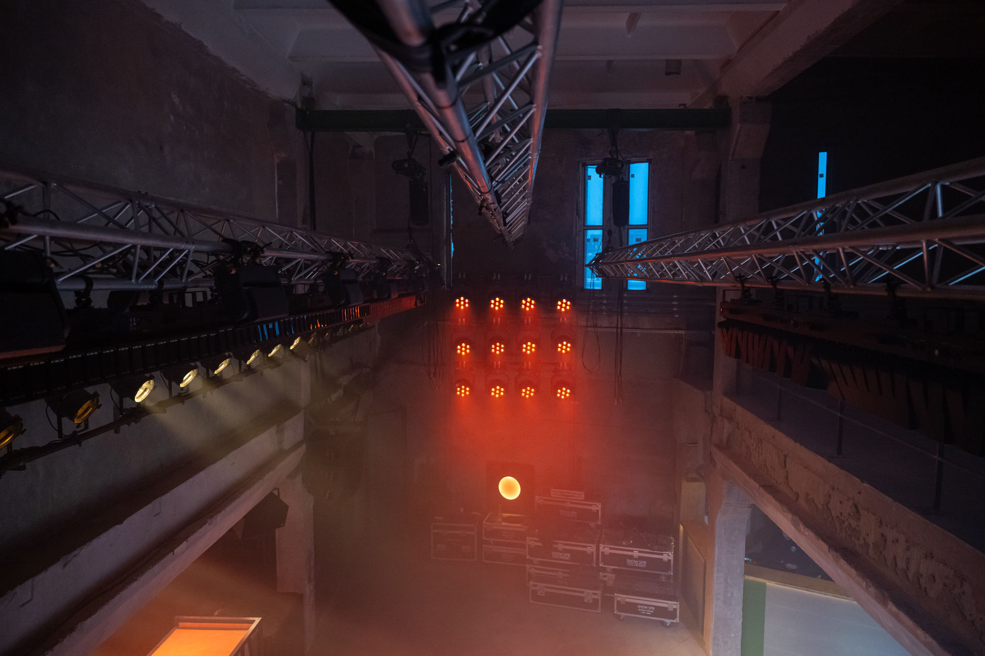 Разные световые сценарии доступны и на основной сцене, которая предназначена для живых концертов и больших фестивалей. От остального пространства ее отделяет большая штора под потолком — на высоте 8,5 метра. Штору регулирует ручной механизм, который используется в театрах для занавесов.