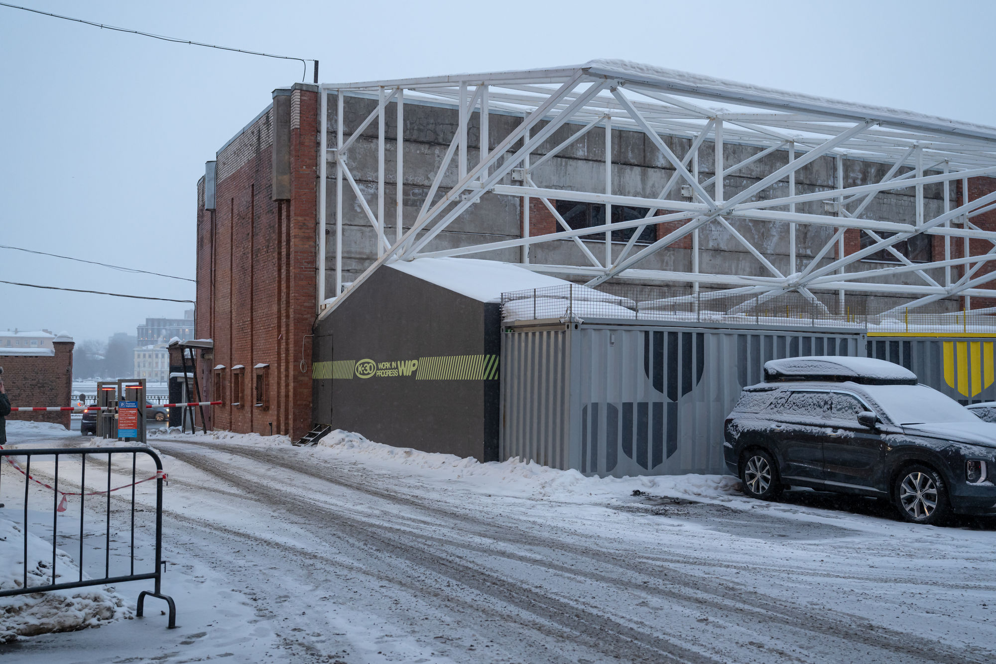 Попасть в «К-30» можно со стороны Синопской набережной — нужно свернуть во внутренний двор, пройти шлагбаумы и выйти на парковку. Входная группа оформлена морскими контейнерами — похожими на те, из которых собрали «К-30» на Кожевенной линии. За ними скрывается внутренний двор и вход на основную площадку внутри корпуса.