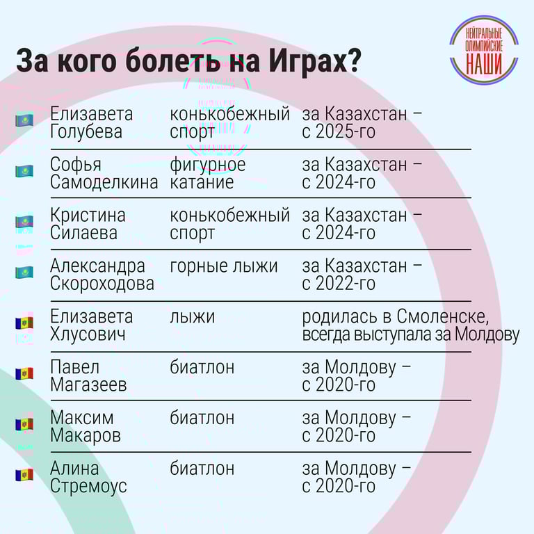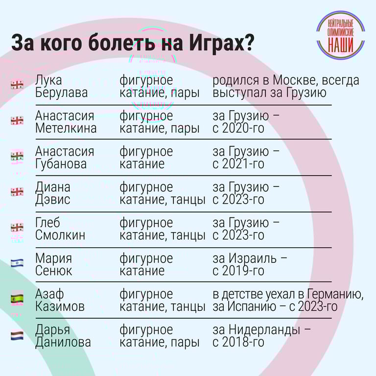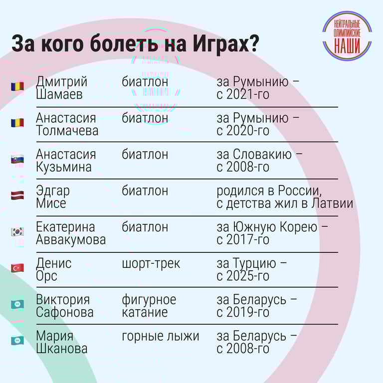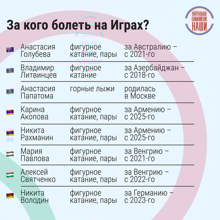 В Милан, по подсчетам «Спорт-Экспресс», приехало не менее 37 спортсменов, которые представляют другие страны и имеют непосредственное отношение к России по месту рождения или членству в сборной. Как мы уже писали, больше всего таких спортсменов в фигурном катании. Полный список выглядит так: