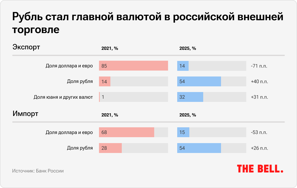 Статистика ЦБ фиксирует тектонический сдвиг в валютной структуре российской внешней торговли. В начале 2022 года доллар и евро обслуживали 87% российского экспорта, на рубль приходилось 12,4%, на юань — 0,4%. К 2025-му ситуация развернулась на 180 градусов: на рубль теперь приходится 54%, на юань — 32%. В импорте картина схожая.