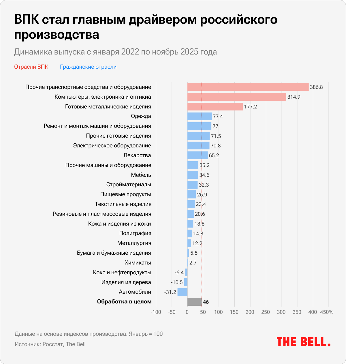 За четыре года обрабатывающая промышленность в целом выросла на 18,3%. Но, если разложить ее на военную и гражданскую части, картина меняется. Оборонные отрасли обеспечили весь этот рост — и даже больше: их вклад в общий показатель превысил 20 п.п. Значит, гражданское производство за тот же период сократилось.