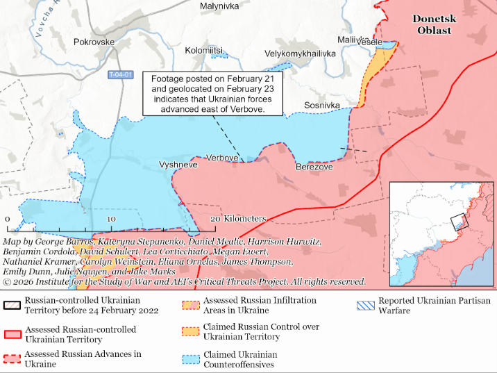 ISW в сводке в ночь на вторник сообщил, что ВСУ в период с 1 по 23 февраля освободили 200 кв. км на некоторых участках в районе Новопавловки, Александровки и Гуляйполя, но потеряли 35 кв. км на других участках этих же направлений в тот же период времени.