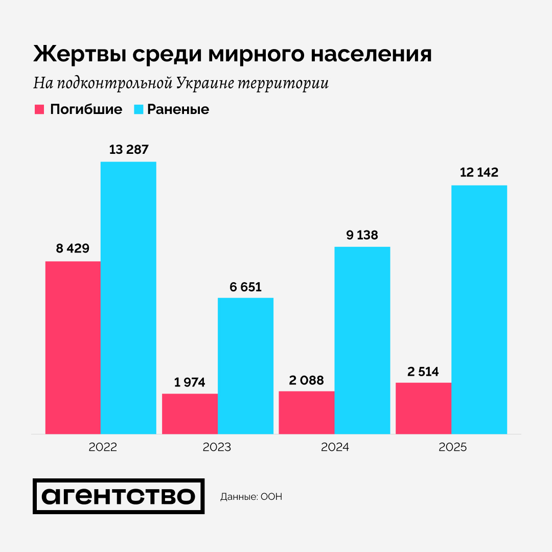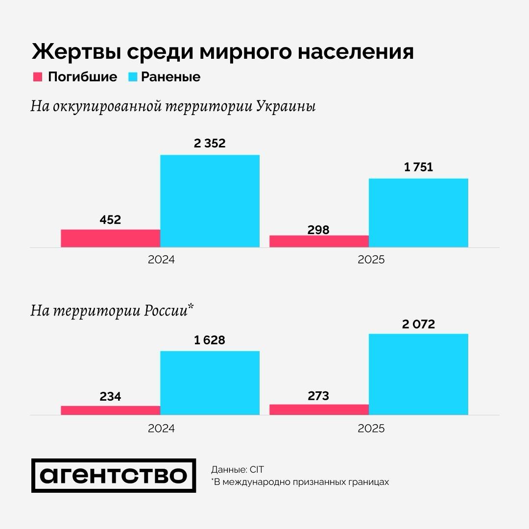 Гибель мирного населения. Для гражданского населения обеих стран 2025 год стал самым смертоносным с 2022 года, свидетельствуютданные Conflict Intelligence Team (CIT). Больше было только в год начала войны, когда Россия штурмовала Мариуполь — последний крупный город, захваченный российскими военными.