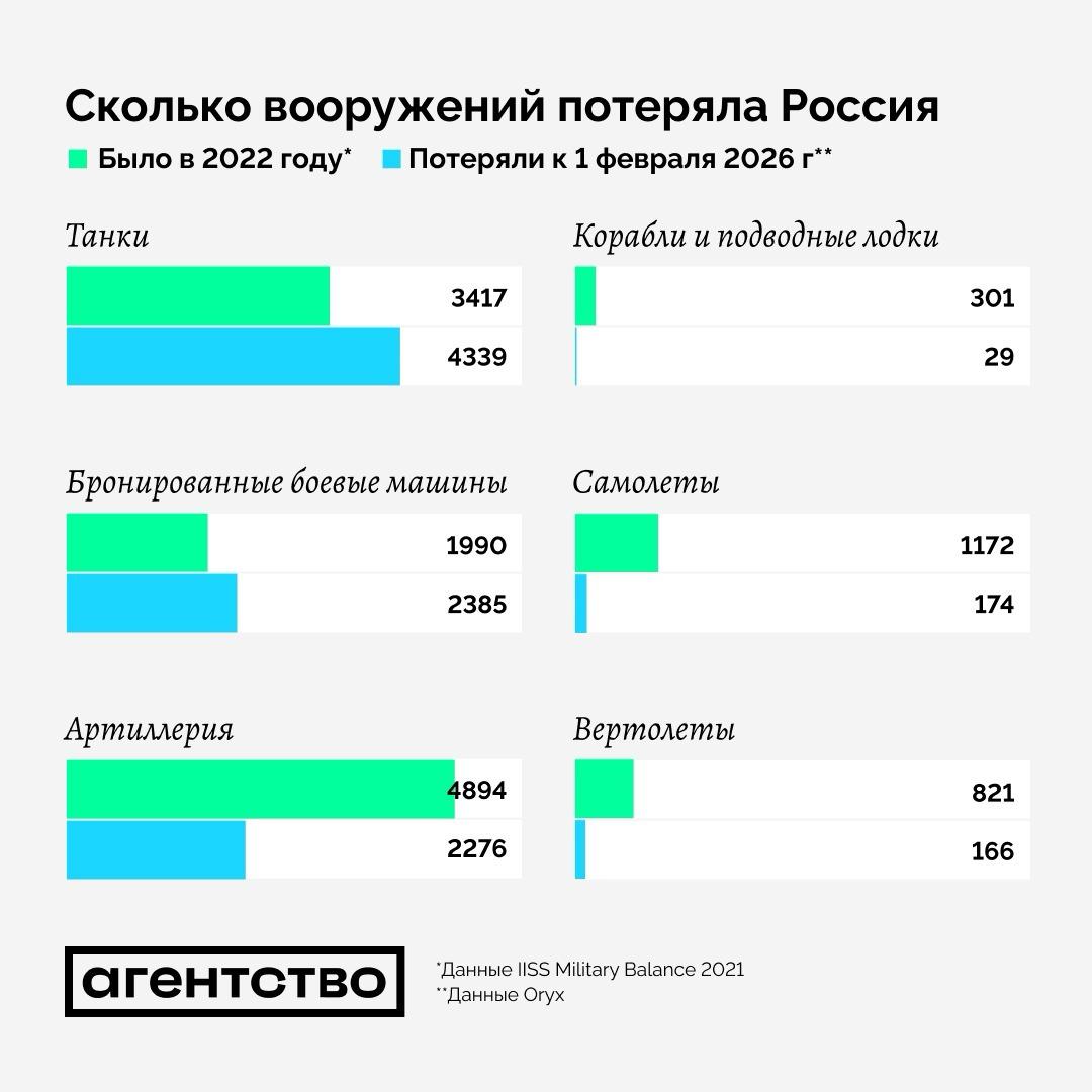 Потери военных. К 23 февраля Россия потеряла от 1,1 до 1,4 млн военных, из которых от 230 тысяч до 430 тысяч погибли, пишет The Economist. Это значит, что каждый 25-й российский мужчина в возрасте от 18 до 49 лет мог быть убит или покалечен на фронте. По данным Центра стратегических и международных исследований (CSIS), с февраля 2022 года по декабрь 2025 года Россия потеряла 1,2 млн солдат, от 275 до 325 тысяч из которых погибли.