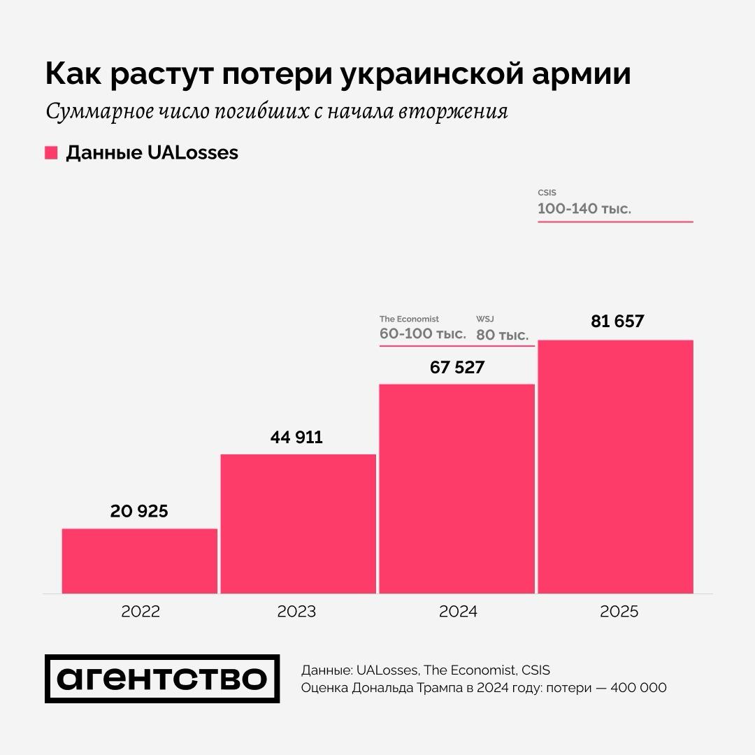 За четыре года российского вторжения в Украину этот конфликт стал самым кровавым для России со времен Второй мировой войны. Число только погибших военных может превышать полмиллиона человек, общее число потерь достигает 2 млн человек. При этом число потерь растет: по данным западных чиновников, в последние месяцы они даже превышают скорость набора добровольцев. Это не приводит к ускорению продвижения на фронте: в 2025 году российская армия захватила меньше 1% украинской территории.