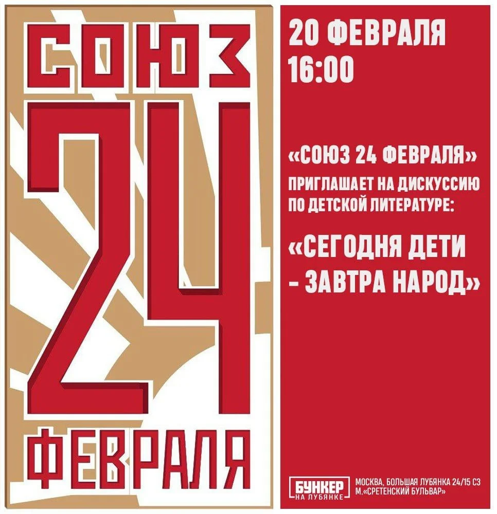 На четырех стульях на фоне кирпичной стены сидят странно одетые женщины и мужчины. Они постоянно сменяют друг друга: то ли потому, что в онлайн-трансляцию вмещается лишь четыре персонажа, то ли потому, что стульев в «Бункере» просто не хватило. «Бункер на Лубянке» — культурный центр, в котором гнездится Z-литературный истеблишмент и где состоялся круглый стол, посвященный проблемам современной детской литературы под названием «Сегодня дети — завтра народ». В комментариях к трансляции справедливо заметили: «А что, дети не народ, что ли?» Но, видимо, организаторам показалось, что название сие звучит громогласно и патриотично, а значит — подойдет. Характерно, что на эту тему деятели российской литературы решили поговорить именно в бункере.