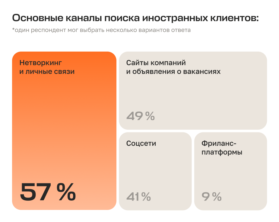 Участники исследования Paper Agency x Mellow чаще всего находят зарубежных клиентов и работодателей не через агрегаторы вакансий, а через личные контакты и группы для специалистов. Основным каналом выхода на иностранный рынок респонденты называют нетворкинг и личные связи — об этом говорят 57 % опрошенных.