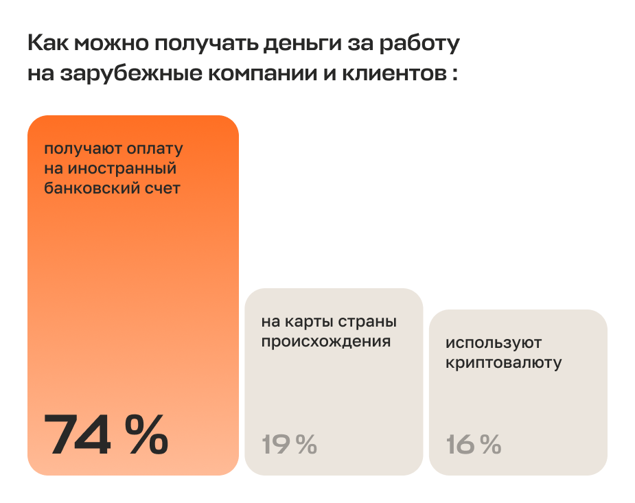 По данным исследования Paper Agency и Mellow, большинство сотрудников, работающих с иностранными клиентами, получают оплату на иностранный банковский счет — так ответили 74 % респондентов. Также 16 % получают оплату в криптовалюте. Каждый опрошенный мог выбрать несколько вариантов ответа.