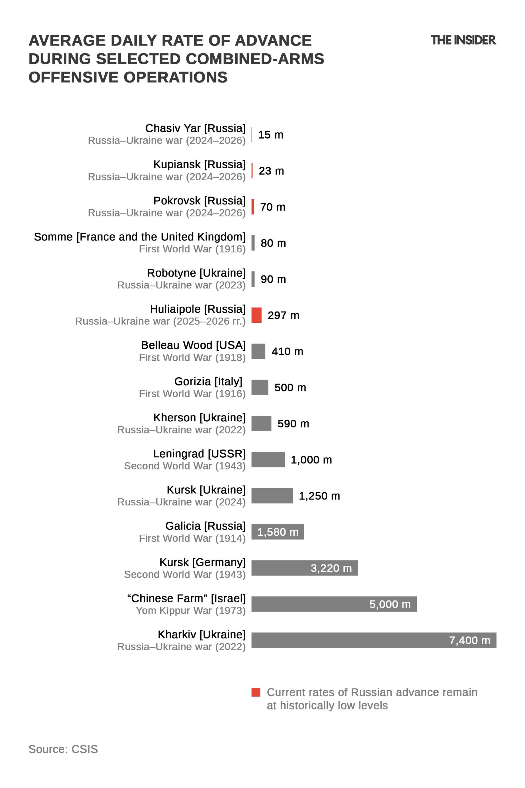 According to calculations by the Washington-based CSIS think tank, the pace of Russia’s territorial gains in its largest ongoing offensive operations — the battles for Chasiv Yar, Kupiansk, and the Pokrovsk–Myrnohrad urban area — ranges from 15 to 70 meters per day, even slower than the allies progress in the World War I Battle of the Somme.