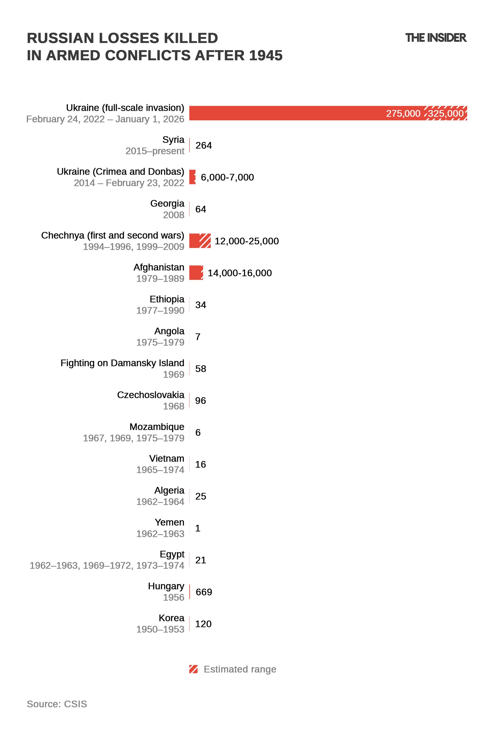 According to CSIS, the number of people killed in the war on the Russian side ranges from 275,000 to 325,000, roughly five times greater than all combat deaths sustained by the USSR and Russia in every armed conflict since 1945, including the operations in Afghanistan and Chechnya.