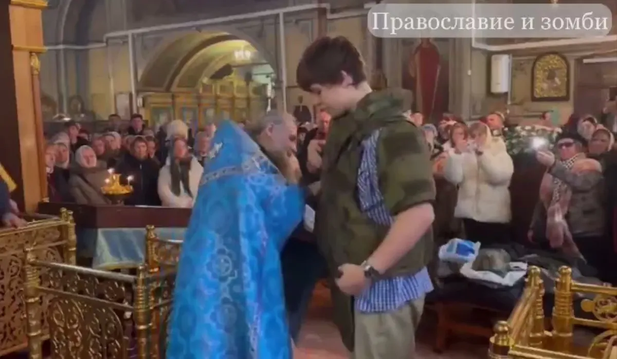 Обладательница медали «Шторм Z» монахиня Евгения (Цивцивадзе), прославившаяся своими сборами во главе волонтерской группы «Помощь братьям», представила 11 февраля походно-полевой храм нового типа. «Иконостас», если его можно так назвать, венчает лозунг «Za Родину!», чуть ниже — распятый Христос, наложенный на цитаты из раздела УК РФ «Преступления против военной службы» (кстати, Христос и правда не служил…). В правой части «иконостаса» — указы президента РФ, в левой — распечатки каких-то пропагандистских статей, лишь в самом низу — иконы святых и стопки «молитвословов воина» перед ними.