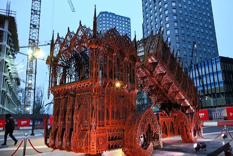 Наконец, финальная часть временной экспозиции «ЗИЛАРТа» на пятом этаже (которая, как и африканская выставка, будет доступна до начала следующего года) представляет проект художника Гриши Брускина «Dies IIIa/Тот день». На эту часть требуется приобретать отдельный билет (что может быть довольно затруднительно, учитывая немалую цену за посещение и первых двух выставок), причем продажа осуществляется по сеансам.