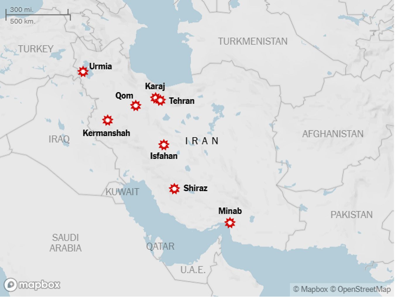 Обновлено 16:15. The New York Times публикует карту ударов по территории Ирана — взрывы были зафиксированы в столице Тегеране, на западе и на юге страны.