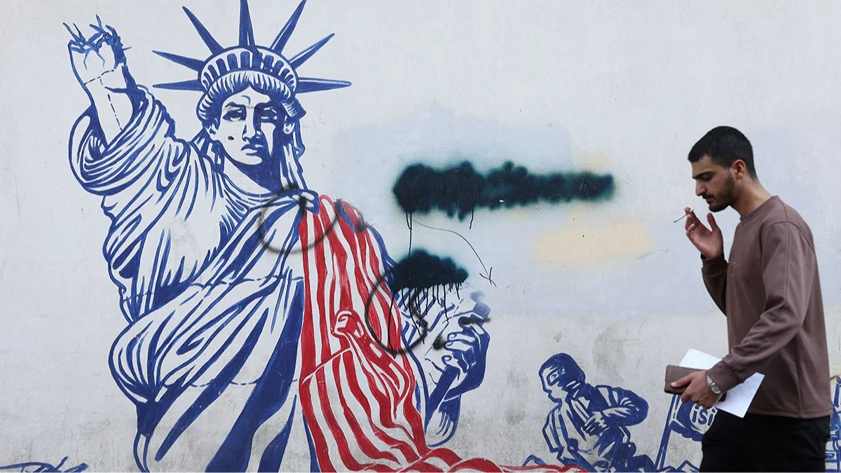 Мужчина проходит мимо фрески, изображающей поврежденную статую Свободы, на улице в Тегеране, Иран, 26 февраля 2026 года. Фото: Majid Asgaripour / WANA / Scanpix / LETA