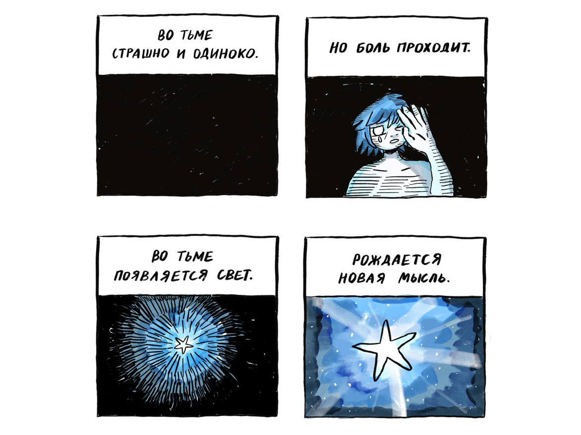 Люди с ПРЛ, читавшие мой комикс, писали мне очень приятные, пронзительные фидбеки про то, как точно комикс описывает то, что происходит у них на душе. Мне нравится, что у меня есть возможность рисовать, делиться тем, что у меня внутри, и этим объединять людей и помогать им. Как будто это моя миссия: облегчить чьи-то страдания и превратить боль в искусство. Думаю, такая романтизация очень помогает жить.