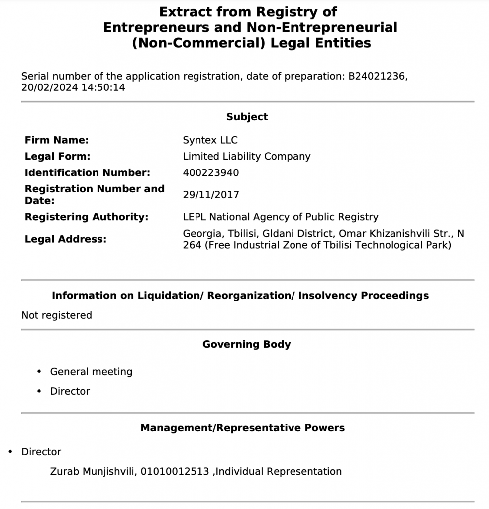 Syntex company is indeed registered at the Tbilisi address. According to the Georgian business register, it belongs to a 59-year-old local businessman Zurab Munjishvili, as “Chronicles” has verified. In 2024, the company changed its name to “Agrobiotech”.