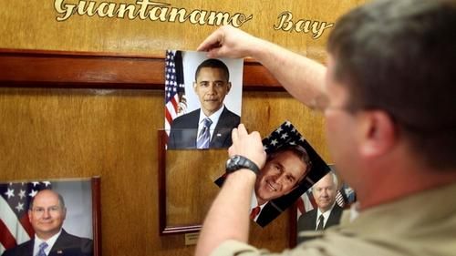 Смена официального портрета Джорджа Буша на портрет Барака Обамы на базе в Гуантанамо. 200 9г.
