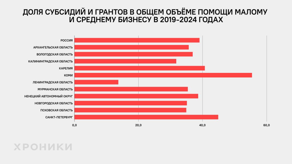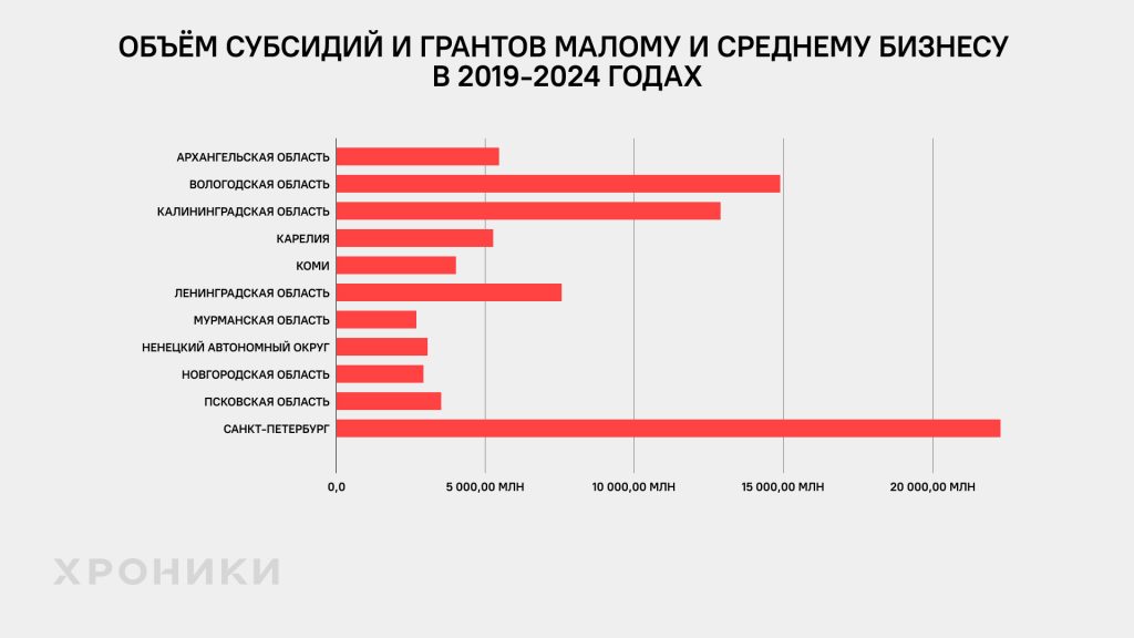 Начиная с 2019 года, согласно Единому реестру субъектов малого и среднего предпринимательства, таких субсидий и грантов по всей стране выделили 881,8 млрд рублей. Почти 10% или 84,8 млрд из них пришлись на 11 регионов СЗФО.