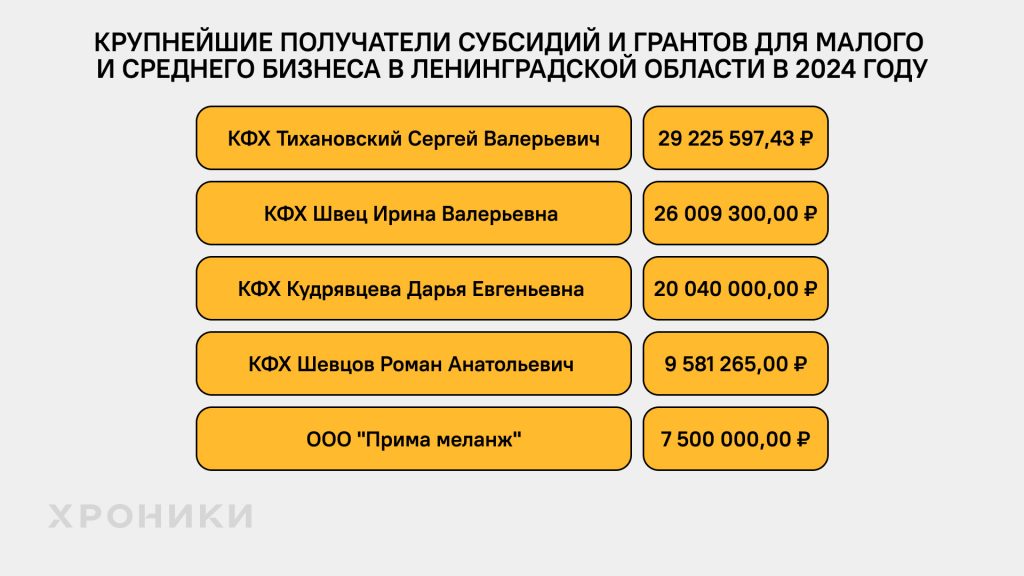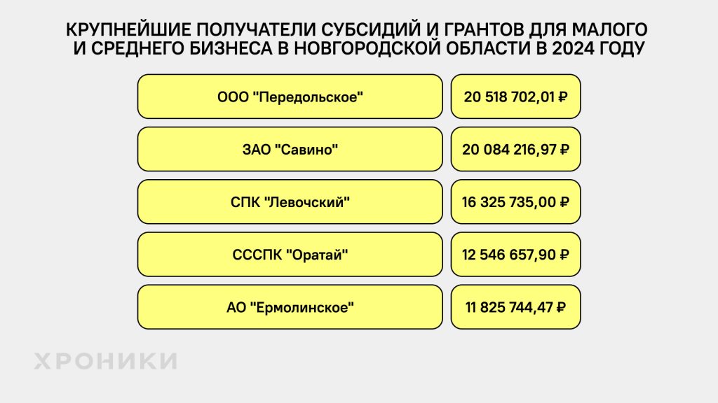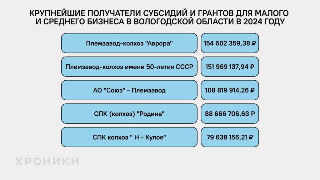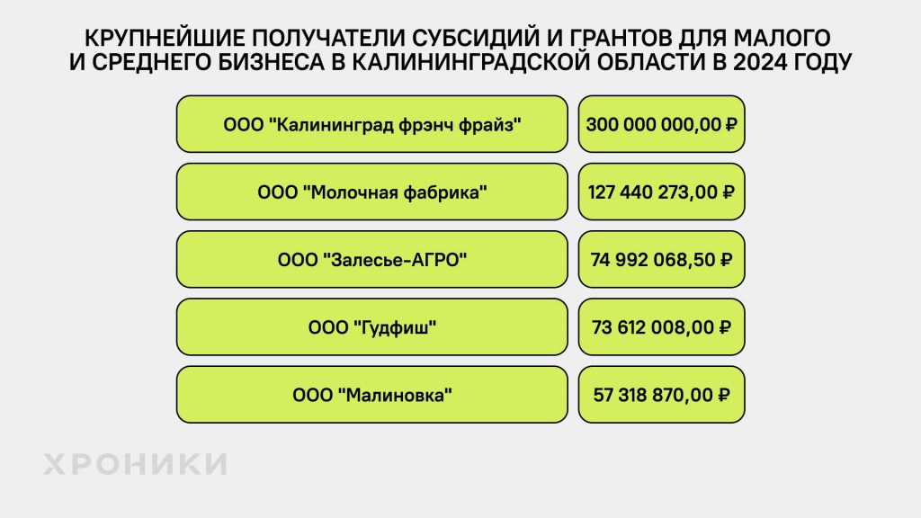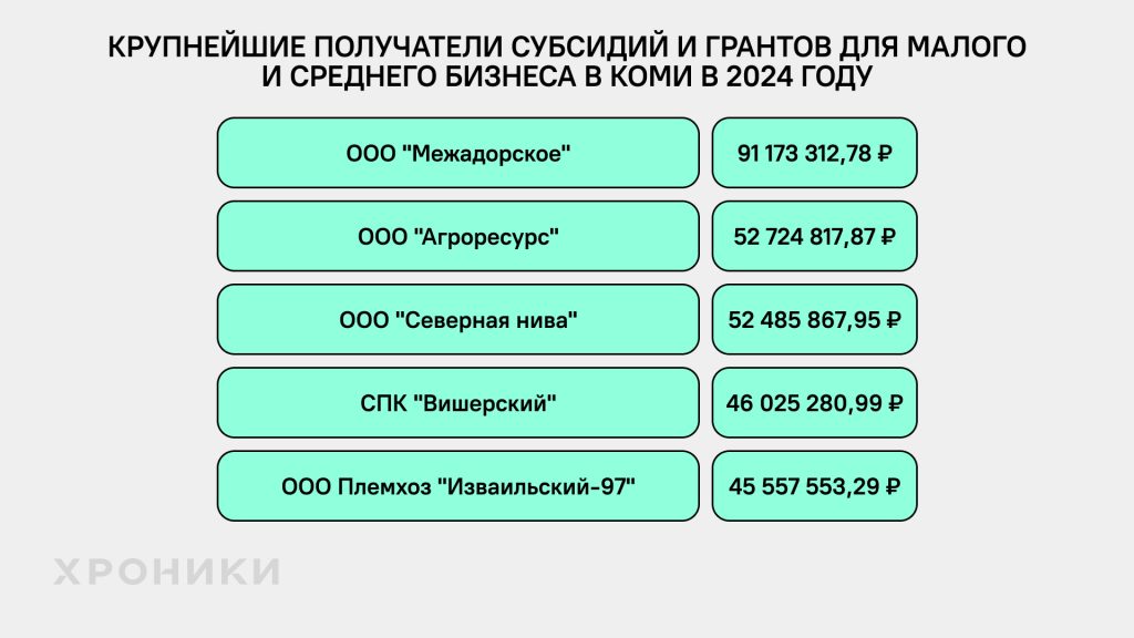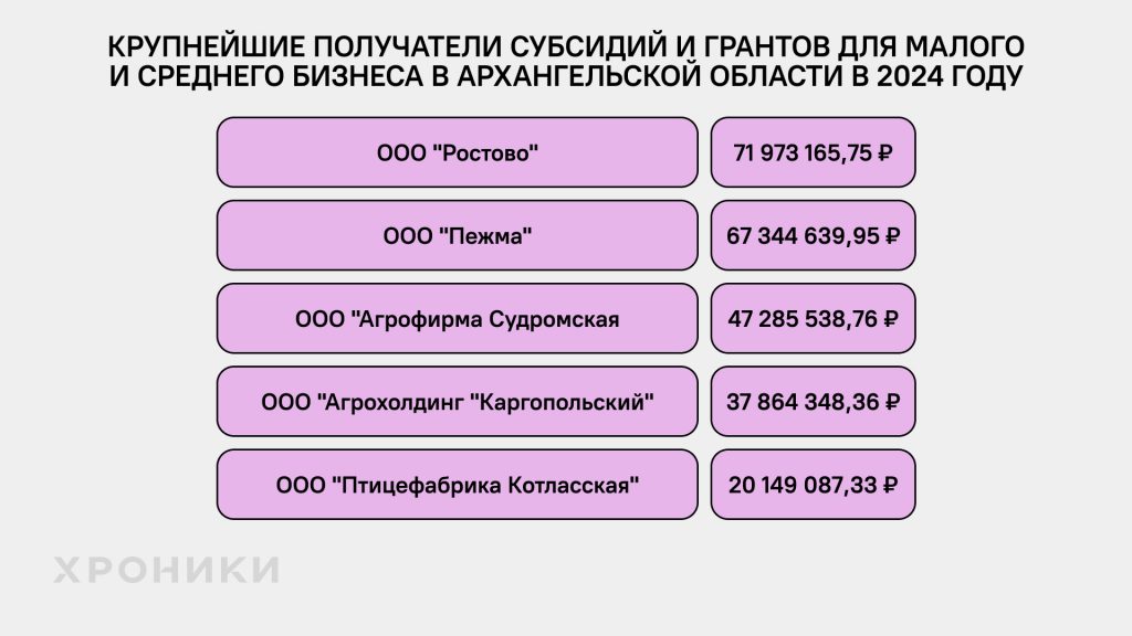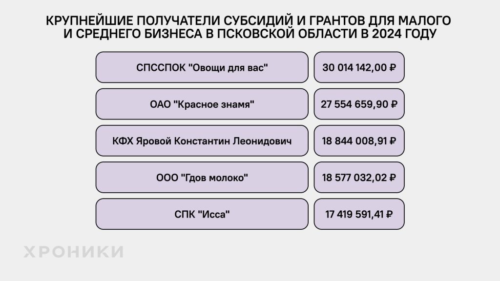 Самые крупные суммы в большинстве регионов в 2024 году получили сельскохозяйственные компании, хотя случались и исключения. Также надо понимать, что эта сфера не основная для Северо-Запада. В структуре валовой добавленной стоимости региона самая высокая доля этого бизнеса на 2022 год была у Псковской области — 11,6% *. Для сравнения, самый большой показатель в России у Тамбовской области — 30,3%*.