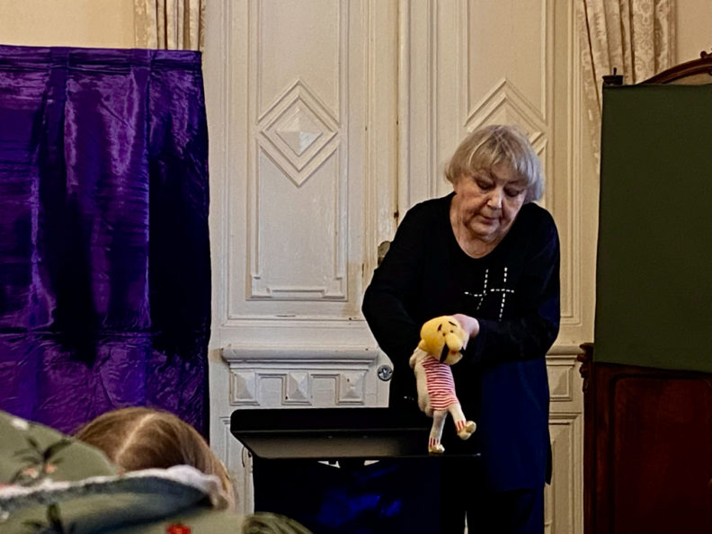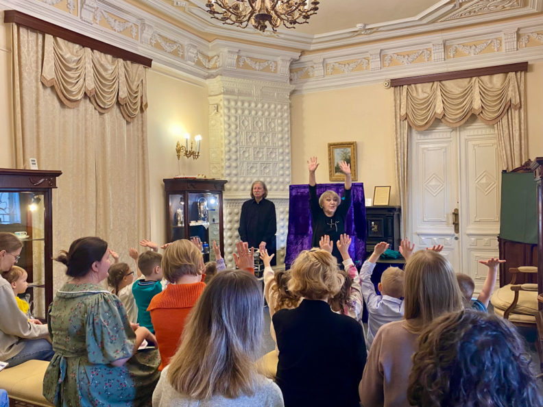 По театральной традиции, представление начинается со звонка, но только не из динамика: Ирина дает колокольчик по очереди каждому зрителю, и когда все позвенели, актеры начинают представление. В спектакле «Такие разные куклы» Ирина Кузина показывает, как можно превращать свои руки в разных персонажей: в шумящее на ветру дерево, в улитку, в петушка — зрители повторяют за ней. Дальше актриса скрывается за ширмой, чтобы раз за разом перевоплотиться с помощью кукол то в заморскую принцессу, то в неуклюжего акробата Спотыкальского, то в обезьянку Грету. Сергей выступает в роли рассказчика и аккомпанирует спектаклю на гармони. Исторический особняк с богатыми комнатами и залами, тяжелыми шторами, старинными сервантами, витринами с фарфором — не совсем то место, где ожидаешь услышать детский смех. Но по субботам здесь именно так.